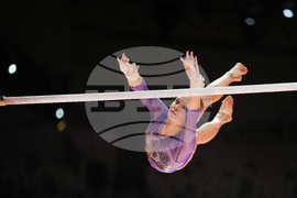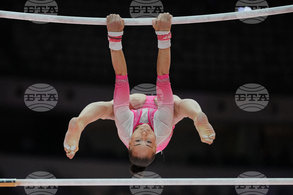 Individual Neutral Athlete Angelina Melnikova competes in the women's uneven bars final during the 53rd Artistic Gymnastics World Championships in Jakarta, Indonesia, Friday, Oct. 24, 2025. (AP Photo/Dita Alangkara)