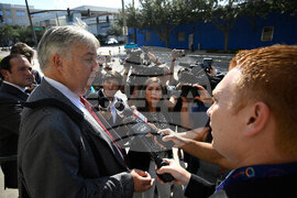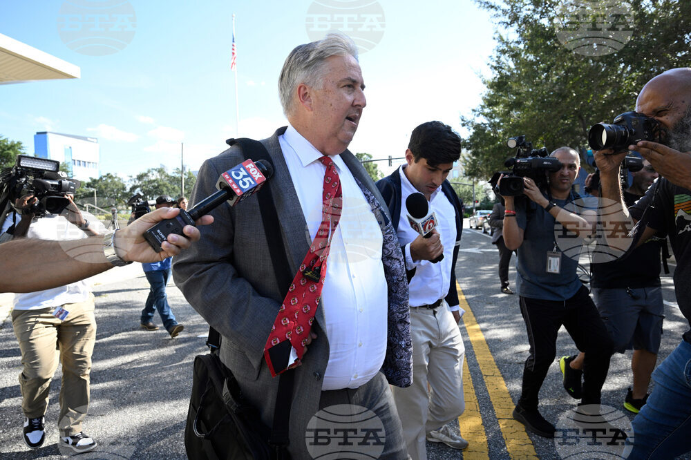 Jim Trusty, center, attorney representing Miami Heat guard Terry Rozier, talks with reporters after leaving the U.S. Federal Courthouse following Rozier's arraignment proceedings, Thursday, Oct. 23, 2025, in Orlando, Fla. (AP Photo/Phelan M. Ebenhack)