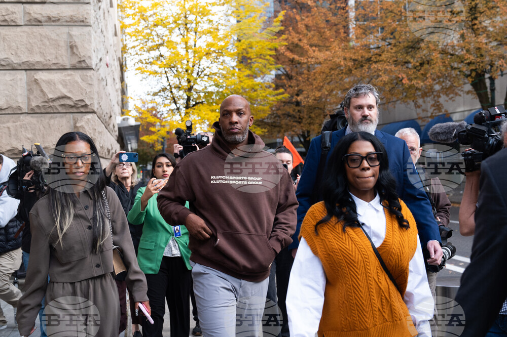 Portland Trail Blazers head coach Chauncey Billups, center, walks to a vehicle after his federal court appearance on Thursday, Oct. 23, 2025, in Portland, Ore. (AP Photo/Jenny Kane)