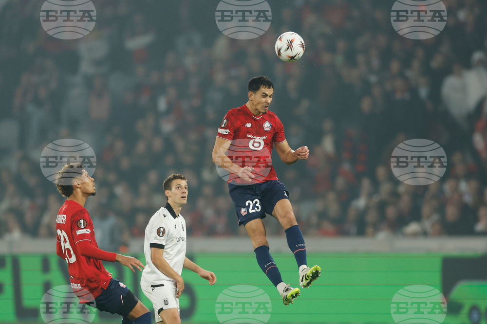 Lille's Aissa Mandi heads the ball during the Europa League opening phase soccer match between Lille and PAOK in Villeneuve-d'Ascq, outside Lille, France, Thursday, Oct. 23, 2025. (AP Photo/Jean-Francois Badias)