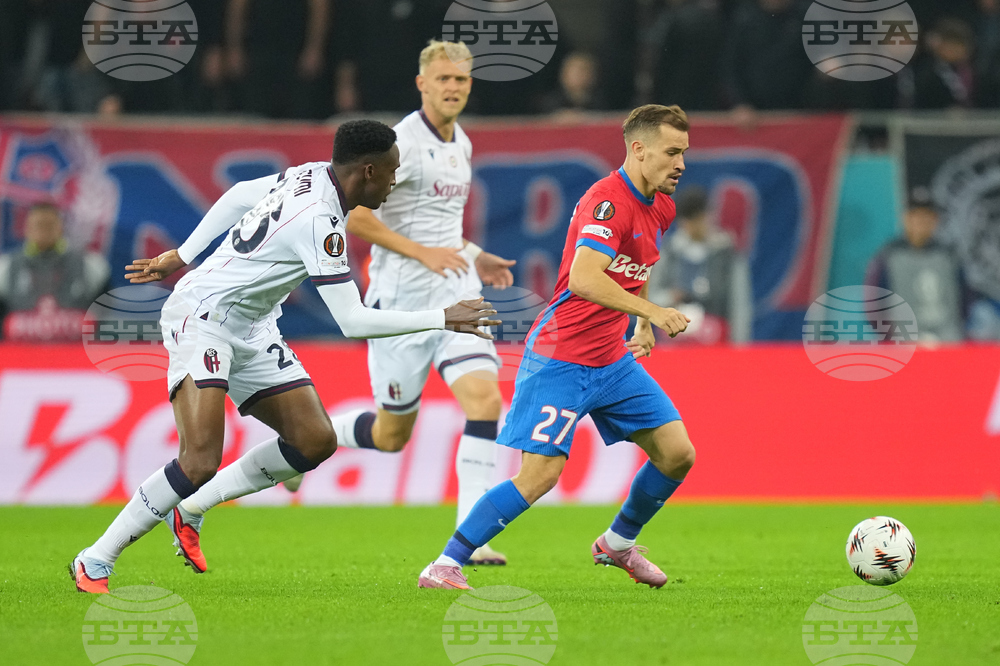 FCSB's Siyabonga Ngezana, right, tries to control the ball next to Bologna's Thijs Dallinga during the Europa League soccer match between FCSB and Bologna, in Bucharest, Romania, Thursday, Oct. 23, 2025. (AP Photo/Andreea Alexandru)