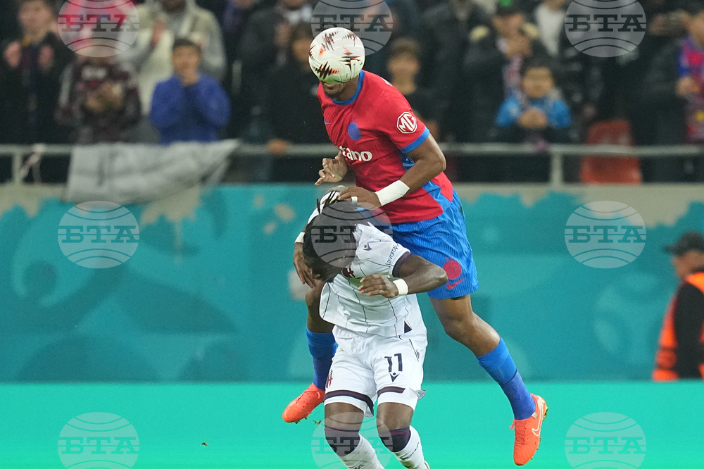 Bologna's Thijs Dallinga, right, challenges for the ball with FCSB's Siyabonga Ngezana during the Europa League soccer match between FCSB and Bologna, in Bucharest, Romania, Thursday, Oct. 23, 2025. (AP Photo/Andreea Alexandru)