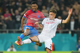 FCSB's Darius Olaru challenges for the ball with Bologna's Jhon Lucumi, left, during the Europa League soccer match between FCSB and Bologna, in Bucharest, Romania, Thursday, Oct. 23, 2025. (AP Photo/Andreea Alexandru)