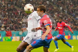 FCSB's Daniel Birligea, right, scores his side's first goal during the Europa League soccer match between FCSB and Bologna, in Bucharest, Romania, Thursday, Oct. 23, 2025. (AP Photo/Andreea Alexandru)