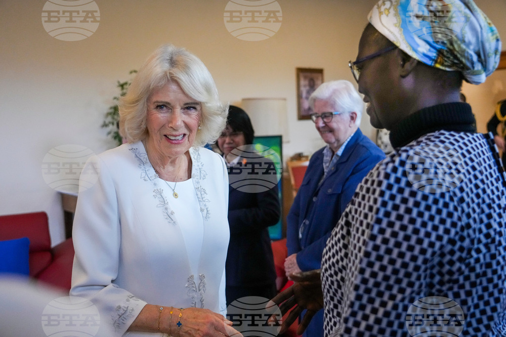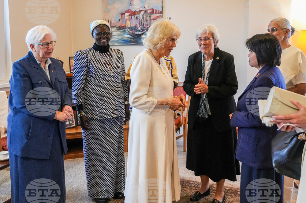 Britain's Queen Camilla, center, meets with Catholic sisters from the International Union of Superiors General, from left, Patricia Murray, Esperance Bamiriyo, Roxanne Schares, and Monica Joseph in Rome, Thursday, Oct. 23, 2025. (AP Photo/Domenico Stinellis)