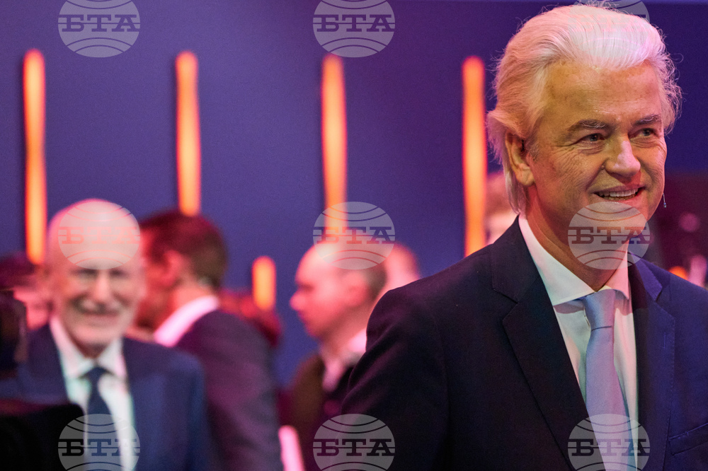 Far-right anti islam lawmaker Geert Wilders of the PVV party, right, and Frans Timmermans, of the center-left two-party bloc of Labor Party and Green Left, rear left, arrive for a debate at the SBS6 TV studio in Hilversum, Netherlands, Thursday, Oct. 23, 2025. (AP Photo/Peter Dejong)