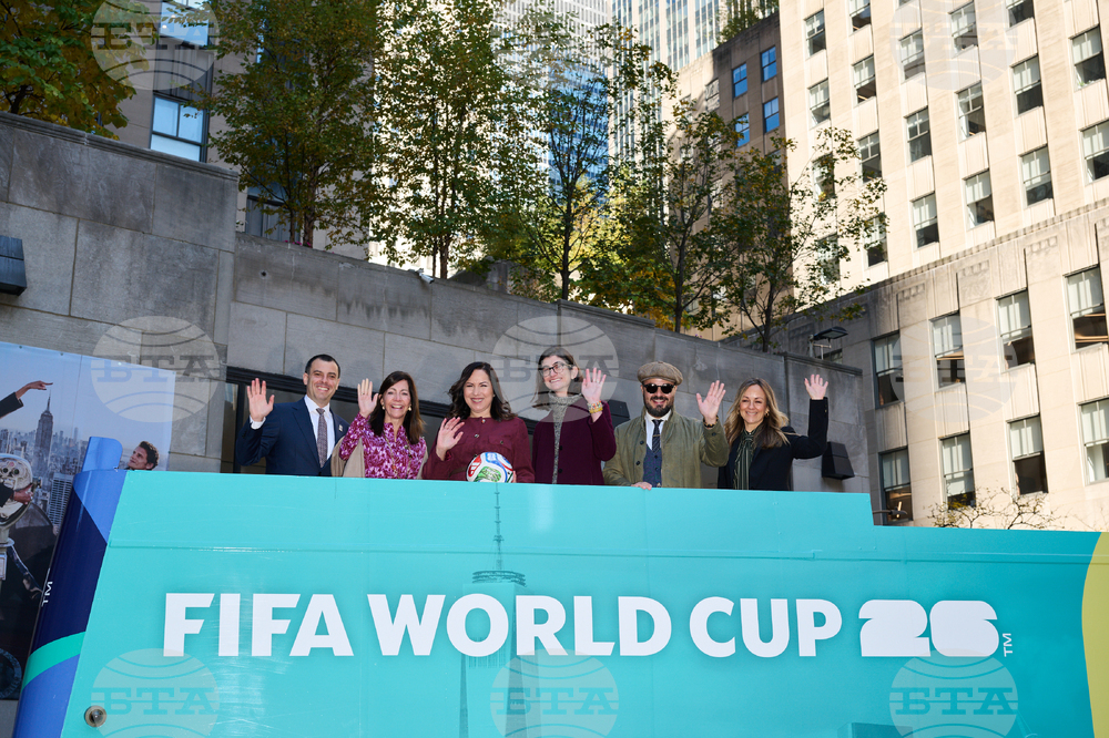 IMAGE DISTRIBUTED FOR TISHMAN SPEYER - Rockefeller Center Announced as Official Manhattan Fan Village for FIFA World Cup 2026. Representatives from NYNJ Host Committee, Telemundo, and Rockefeller Center announced New York New Jersey World Cup 26 & Telemundo Fan Village at Rockefeller Center on Thursday, October 23rd, 2025 in New York. [L to R: Deputy Chief of Staff to Mayor Eric Adams Madeline Labadie; Head of Rockefeller Center EB Kelly; First Lady of New Jersey & Board Chair, FIFA World Cup 2026 NYNJ Host Committee Tammy Murphy; Telemundo Reporter Verónica Contreras; CEO, FIFA World Cup 2026 NYNJ Host Committee Alex Lasry; and Executive Vice President of Marketing & Creative at Telemundo Claudia Chagui]. (Loren Matthew/AP Content Services for Tishman Speyer)