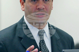 FILE - David Herrera Urias, attorney for plaintiffs, questions a witness during the school finance trial Aug. 26, 2004, in Austin, Texas. (AP Photo/Harry Cabluck, File)