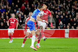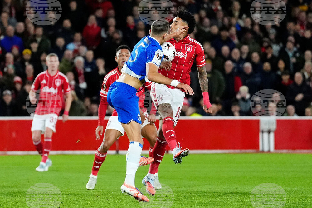Porto's Samu Aghehowa, left, and Nottingham Forest's Nikola Milenkovic battle for the ball during the UEFA Europa League match between Nottingham Forest and Porto, in Nottingham, England, Thursday Oct. 23, 2025. (Mike Egerton/PA via AP)