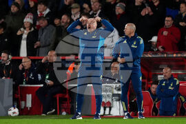 Nottingham Forest manager Sean Dyche reacts on the touchline during the UEFA Europa League match between Nottingham Forest and Porto, in Nottingham, England, Thursday Oct. 23, 2025. (Mike Egerton/PA via AP)