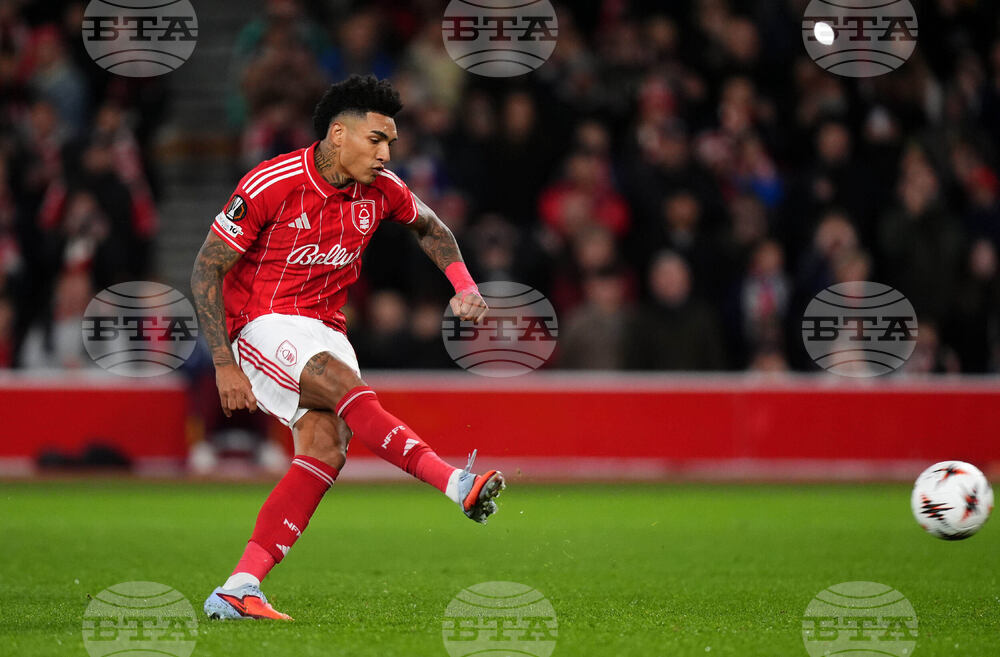 Nottingham Forest's Igor Jesus scores their side's second goal of the game from the penalty spot during the UEFA Europa League match between Nottingham Forest and Porto, in Nottingham, England, Thursday Oct. 23, 2025. (Mike Egerton/PA via AP)