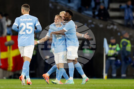Malmo's Oscar Lewicki celebrates after scoring their side's first goal of the game during the Europa League soccer match between Malmö FF and GNK Dinamo Zagreb, in Malmo, Sweden, Thursday Oct. 23, 2025. (Andreas Hillergren/TT News Agency via AP)