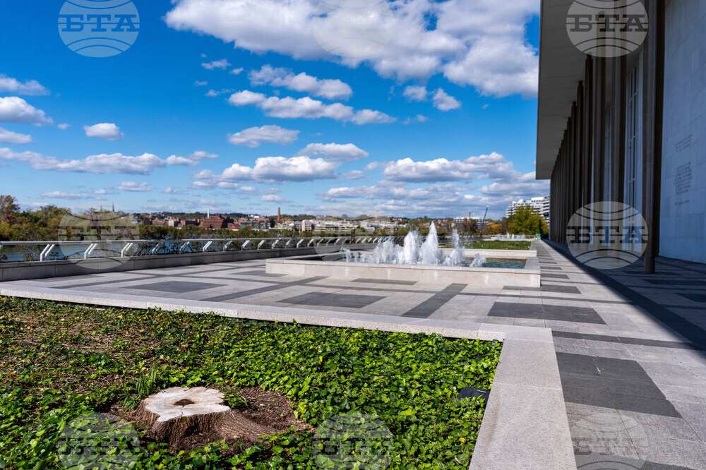 Tree stumps are pictured at the Kennedy Center, Thursday, Oct. 23, 2025, in Washington. (AP Photo/Alex Brandon)