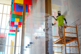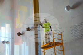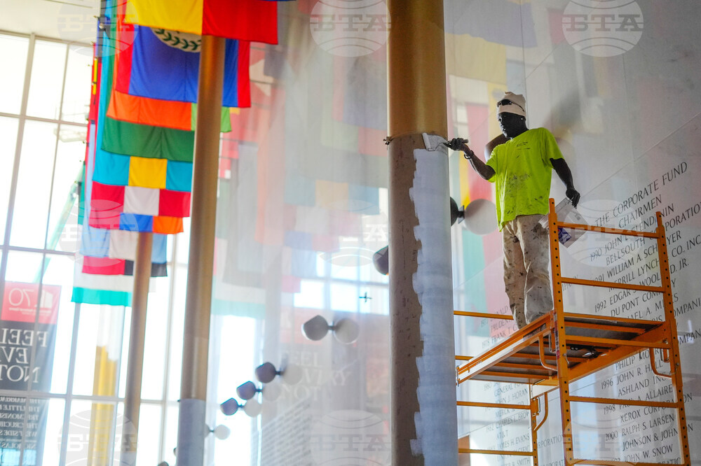 Odden Shaw painting over a gold colored column inside the Hall of Nations at the Kennedy Center for Performing Arts in Washington, Friday, Oct. 24, 2025, in preparation for upcoming FIFA World Cup 2026 Final Draw. (AP Photo/Pablo Martinez Monsivais)