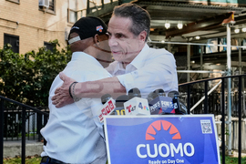 New York Mayor Eric Adams, left, and Democrat mayoral candidate Andrew Cuomo embrace during a campaign event outside the George Washington Carver Houses, in New York, Thursday, Oct. 23, 2025. (AP Photo/Richard Drew)