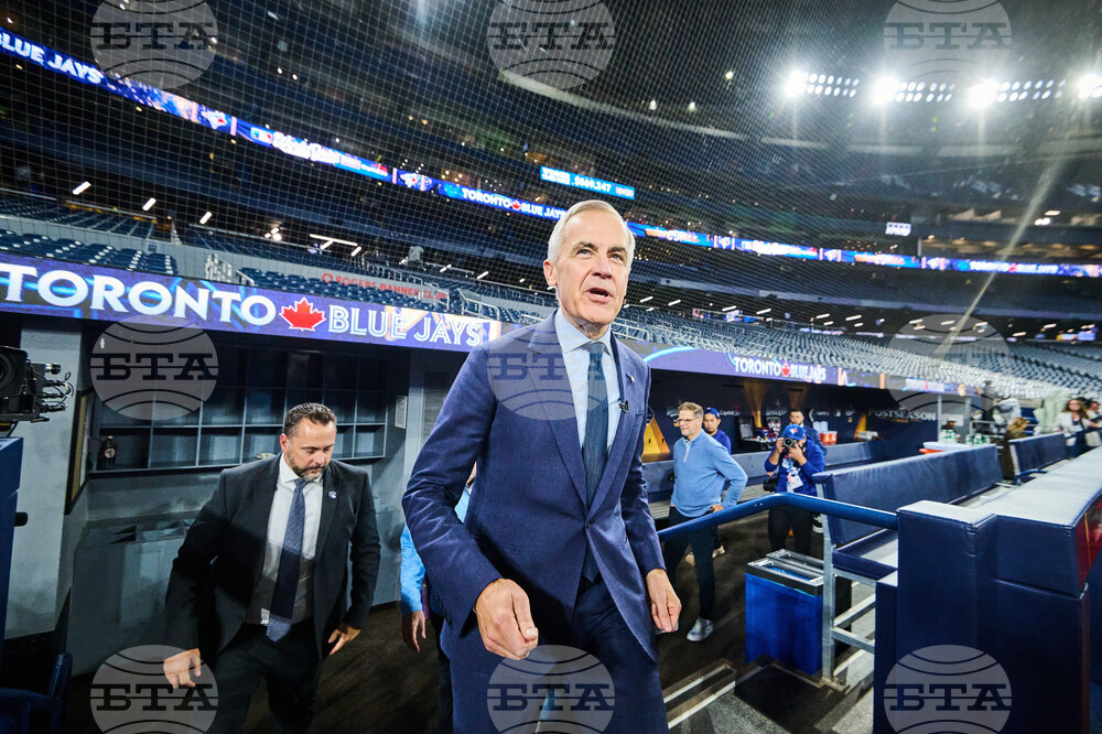 Canada's Prime Minister Mark Carney steps out of the Toronto Blue Jays' dugout as he visits the team on their media day ahead of the World Series against the Los Angeles Dodgers in Toronto, Thursday, Oct. 23, 2025. (Sammy Kogan/The Canadian Press via AP)