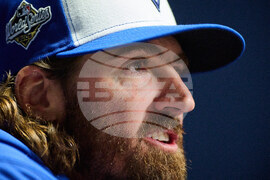 Toronto Blue Jays' Kevin Gausman speaks to media during the Toronto Blue Jays' media day ahead of the 2025 World Series against the Los Angeles Dodgers in Toronto, on Thursday, Oct. 23, 2025. (Sammy Kogan/The Canadian Press via AP)