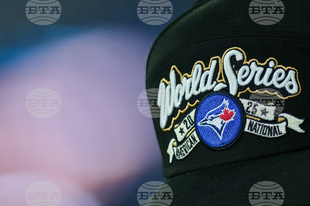 World Series signage lines the dugouts at Rogers Centre ahead of the 2025 World Series between the Toronto Blue Jays and the Los Angeles Dodgers in Toronto, on Thursday, Oct. 23, 2025. (Sammy Kogan/The Canadian Press via AP)