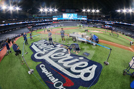 The World Series logo is seen on the field at Rogers Centre ahead of the 2025 World Series between the Toronto Blue Jays and the Los Angeles Dodgers in Toronto, on Thursday, Oct. 23, 2025. (Sammy Kogan/The Canadian Press via AP)