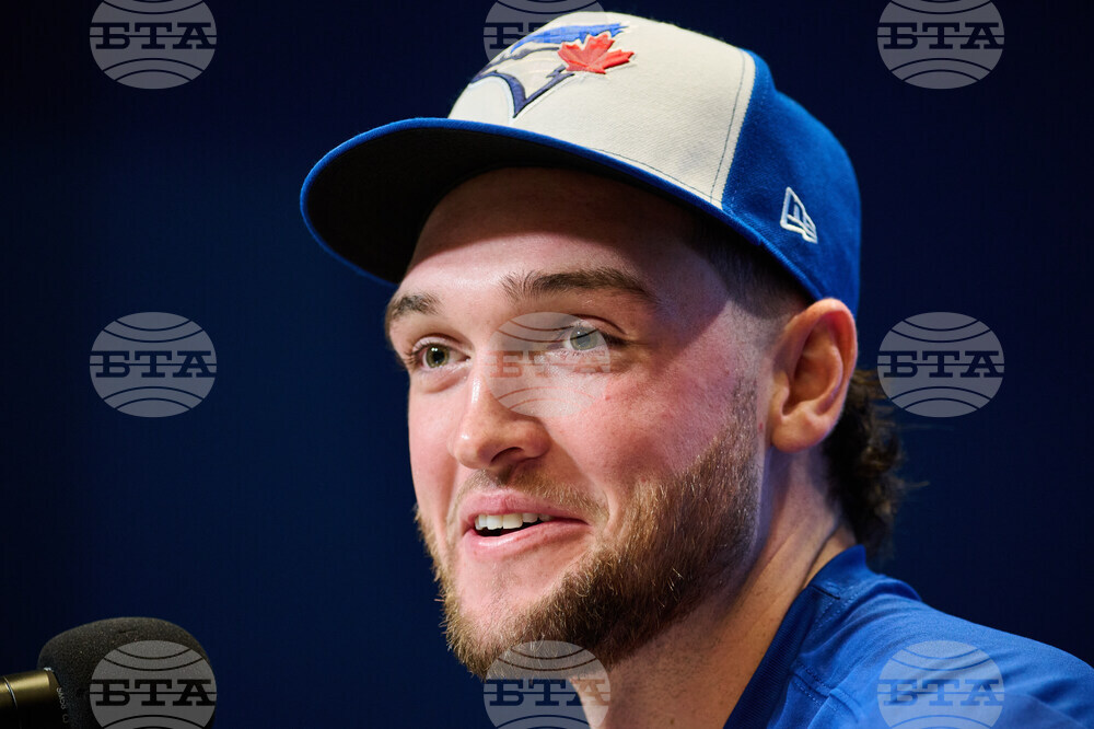 Toronto Blue Jays' Trey Yesavage speaks to media during the Toronto Blue Jays' media day ahead of the 2025 World Series against the Los Angeles Dodgers in Toronto, on Thursday, Oct. 23, 2025. (Sammy Kogan/The Canadian Press via AP)