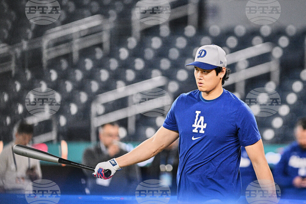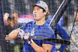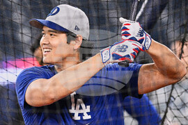 Los Angeles Dodgers' Shohei Ohtani (17) hits during batting practice ahead of the 2025 World Series against the Toronto Blue Jays in Toronto, on Thursday, Oct. 23, 2025.(Sammy Kogan/The Canadian Press via AP)