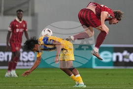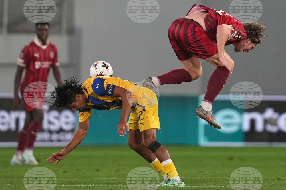 Maccabi Tel Aviv's Dor Peretz, lett, and Midtjylland's Mads Bech Sorensen collide during the Europa League opening phase soccer match between Maccabi Tel Aviv and Midtjylland in Backa Topola, Serbia, Thursday, Oct. 23, 2025. (AP Photo/Darko Vojinovic)