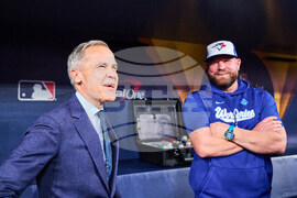 Canada's Prime Minister Mark Carney speaks speaks to Toronto Blue Jays manager John Schneider as he visits the Blue Jays during baseball's World Series media day, Thursday, Oct. 23, 2025, in Toronto,. (Sammy Kogan/The Canadian Press via AP)