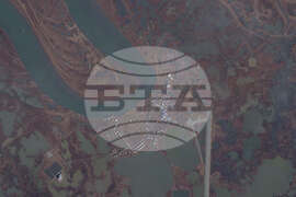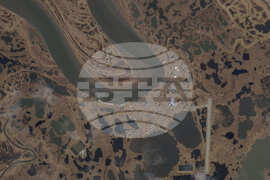 This satellite image from Planet Labs PBC shows the village of Kipnuk, Alaska, on Friday, Oct. 17, 2025, after severe flooding swept away homes and scattered previously abandoned fuel tanks along the banks of the Kugkaktlik River. Footprints of houses swept away by the storm can be seen in the center of the town. (Planet Labs PBC via AP)
