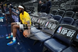 Indiana Pacers' Tyrese Haliburton watches from the bench during the first half of an NBA basketball game against the Oklahoma City Thunder, Thursday, Oct. 23, 2025, in Indianapolis. (AP Photo/Darron Cummings)