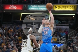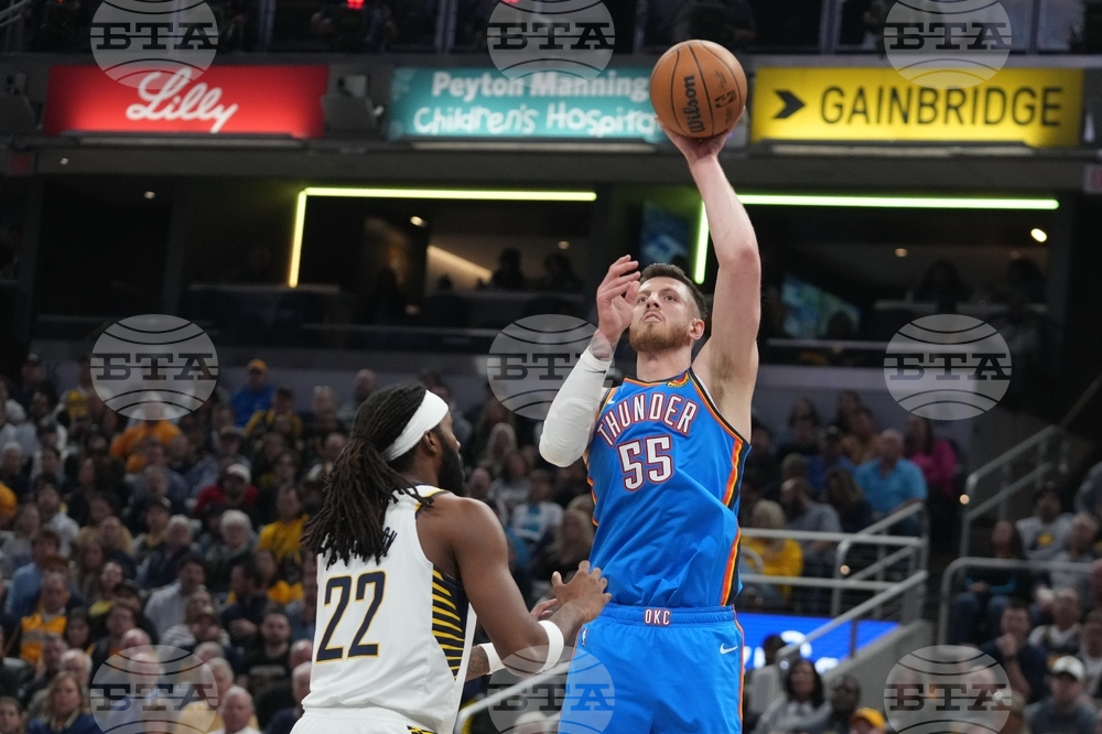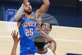 Oklahoma City Thunder's Ajay Mitchell (25) shoots over Indiana Pacers' Tony Bradley (13) during the second half of an NBA basketball game, Thursday, Oct. 23, 2025, in Indianapolis. (AP Photo/Darron Cummings)
