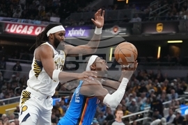 Oklahoma City Thunder's Shai Gilgeous-Alexander (2) puts up a shot against Indiana Pacers' Bennedict Mathurin (00) during overtime of an NBA basketball game, Thursday, Oct. 23, 2025, in Indianapolis. (AP Photo/Darron Cummings)