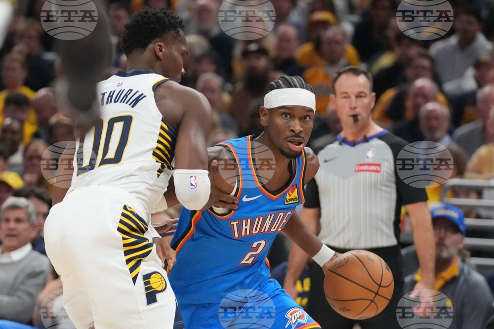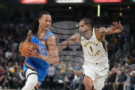 Oklahoma City Thunder's Shai Gilgeous-Alexander (2) is defended by Indiana Pacers' Bennedict Mathurin (00) during the first half of an NBA basketball game, Thursday, Oct. 23, 2025, in Indianapolis. (AP Photo/Darron Cummings)