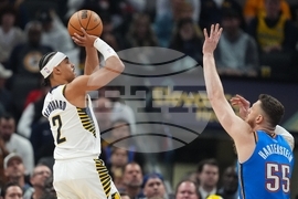 Indiana Pacers' Andrew Nembhard (2) shoots against Oklahoma City Thunder's Isaiah Hartenstein during the first half of an NBA basketball game, Thursday, Oct. 23, 2025, in Indianapolis. (AP Photo/Darron Cummings)