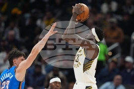 Indiana Pacers' Pascal Siakam (43) shoots over Oklahoma City Thunder's Brooks Barnhizer (23) during the first half of an NBA basketball game, Thursday, Oct. 23, 2025, in Indianapolis. (AP Photo/Darron Cummings)