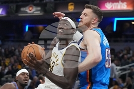 Indiana Pacers' Pascal Siakam (43) goes to the basket against Oklahoma City Thunder's Isaiah Hartenstein (55) during the second half of an NBA basketball game, Thursday, Oct. 23, 2025, in Indianapolis. (AP Photo/Darron Cummings)