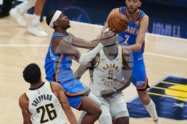 Oklahoma City Thunder's Shai Gilgeous-Alexander (2) is fouled by Indiana Pacers' Isaiah Jackson during the first half of an NBA basketball game, Thursday, Oct. 23, 2025, in Indianapolis. (AP Photo/Darron Cummings)