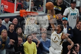 Indiana Pacers' Obi Toppin dunks during the second overtime of an NBA basketball game against the Oklahoma City Thunder, Thursday, Oct. 23, 2025, in Indianapolis. (AP Photo/Darron Cummings)