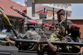 FILE - Soldiers loyal to Col. Michael Randrianirina guard the entrance of the high constitutional court in Antananarivo, Madagascar, Oct. 17, 2025. (AP Photo/Brian Inganga, File)