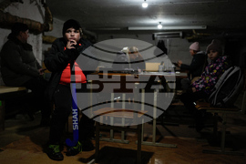 FILE - Tymofii Lifyrynko, 11, leans on his hockey stick while waiting out an air raid alarm in an underground shelter in Shostka, Ukraine, Oct. 16, 2025. (AP Photo/Julia Demaree Nikhinson, File)