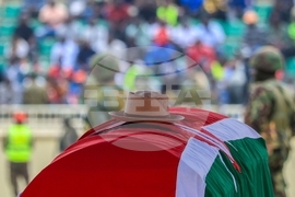 FILE - A signature cowboy hat that former Kenya Prime Minister Raila Odinga loved to wear adorns his coffin during his state funeral at the Nyayo National Stadium in Nairobi, Kenya, Oct. 17, 2025. (AP Photo/Andrew Kasuku, File)