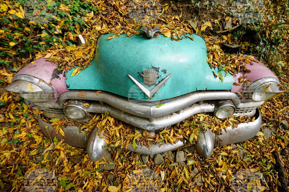 FILE - A vintage Cadillac is covered by autumn leaves inside a private car sculpture park within a forest in Neanderthal Valley in Mettmann, Germany, Oct. 19, 2025. (AP Photo/Martin Meissner, File)