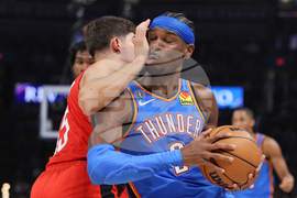 FILE - Oklahoma City Thunder guard Shai Gilgeous-Alexander, right, collides with Houston Rockets guard Reed Sheppard during the first half of an NBA basketball game in Oklahoma City, on Sunday, Oct. 19, 2025. (AP Photo/Nate Billings, File)