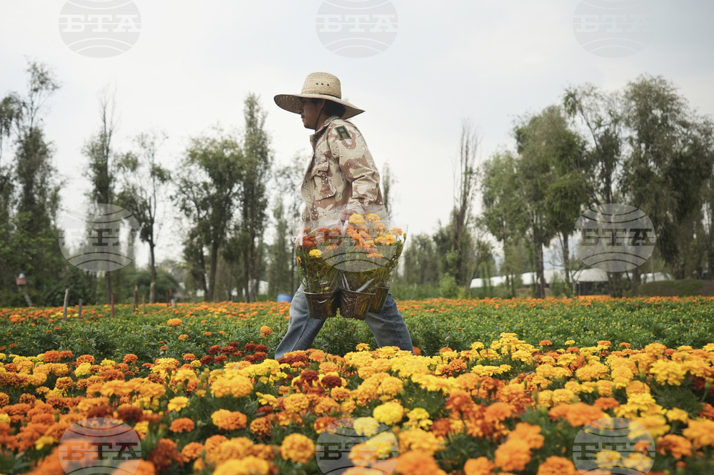 FILE - Farmer Jesus Cuaxospa works on his farm where he grows cempasúchil flowers in San Luis Tlaxialtemalco on the outskirts of Mexico City, Oct. 17, 2025, in preparation for Day of the Dead celebrations. (AP Photo/Claudia Rosel, File)
