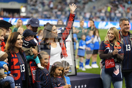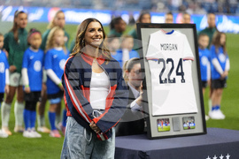United States' Alex Morgan stands during her retirement ceremony before an international friendly women's soccer match between the United States and Portugal, Thursday, Oct. 23, 2025, in Chester, Pa. (AP Photo/Matt Slocum)