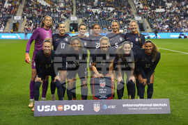 Portugal players pose for a team photo before the first half of an international friendly women's soccer match against United States, Thursday, Oct. 23, 2025, in Chester, Pa. (AP Photo/Matt Slocum)