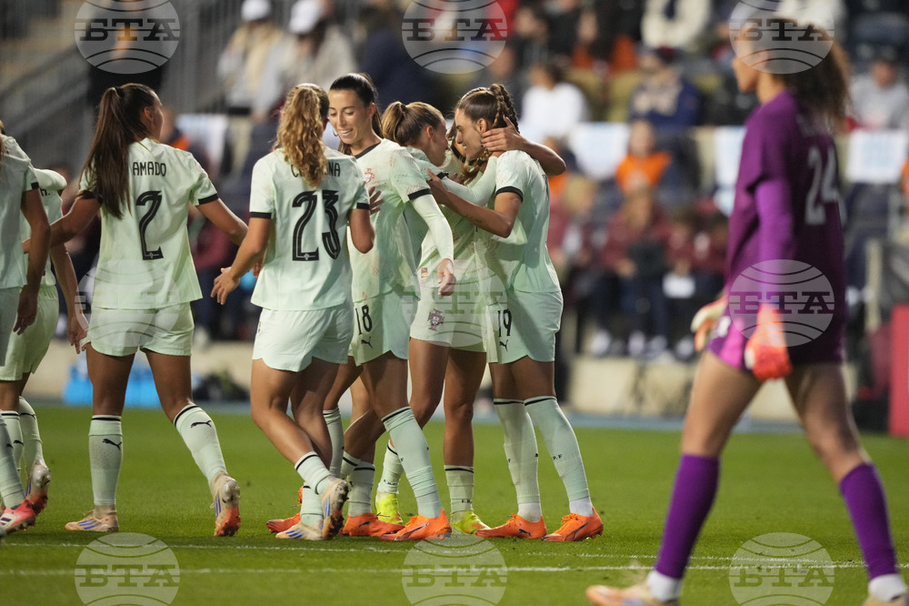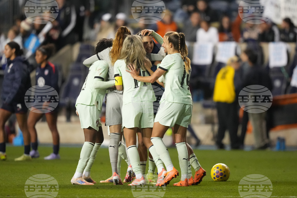 Portugal players celebrate a goal by Fátima Pinto against the United States during the second half of an international friendly women's soccer match, Thursday, Oct. 23, 2025, in Chester, Pa. (AP Photo/Matt Slocum)