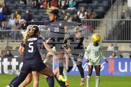 United States' Emily Sonnett, left, vies for a header against Portugal's Kika Nazareth (7) during the second half of an international friendly women's soccer match, Thursday, Oct. 23, 2025, in Chester, Pa. (AP Photo/Matt Slocum)