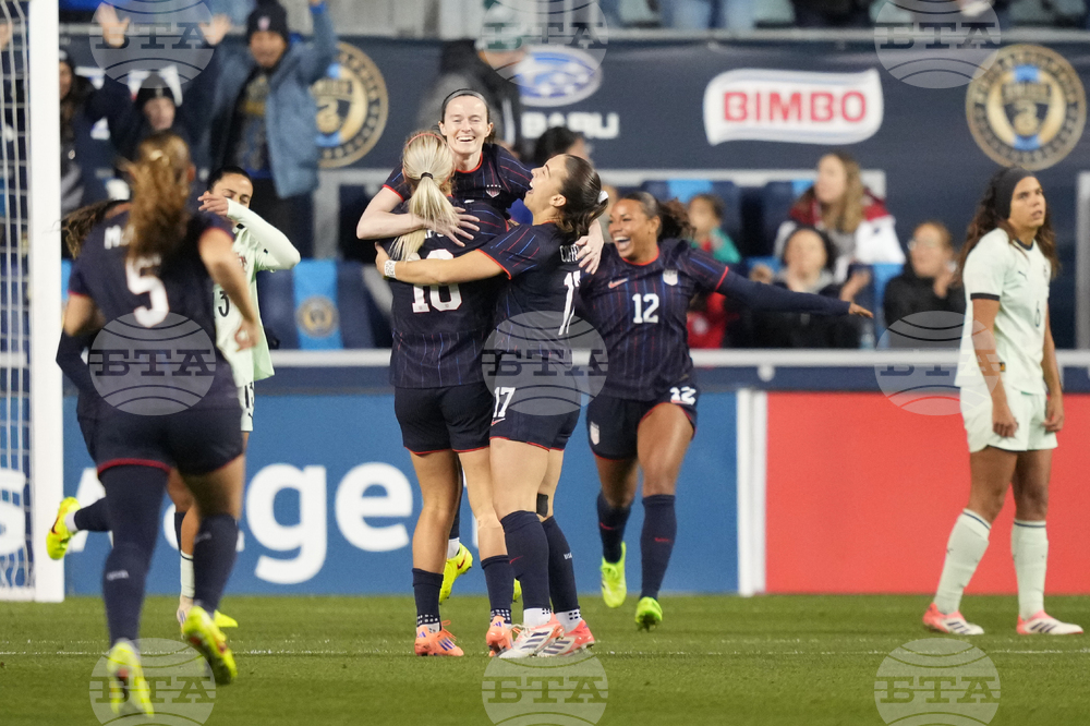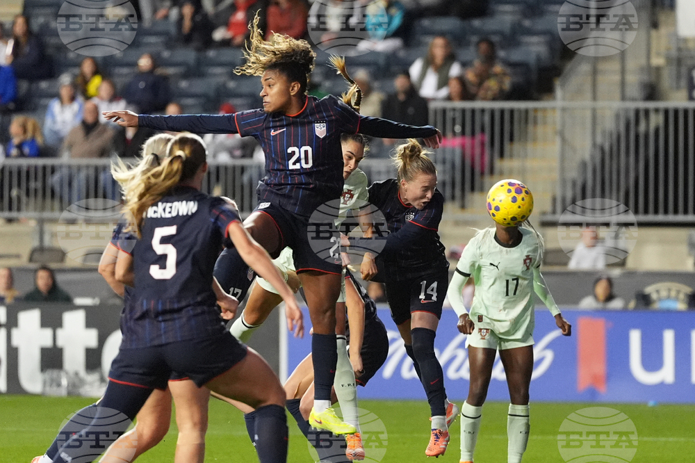 Portugal's Diana Gomes, back center, heads the ball for a goal against the United States during the first half of an international friendly women's soccer match, Thursday, Oct. 23, 2025, in Chester, Pa. (AP Photo/Matt Slocum)