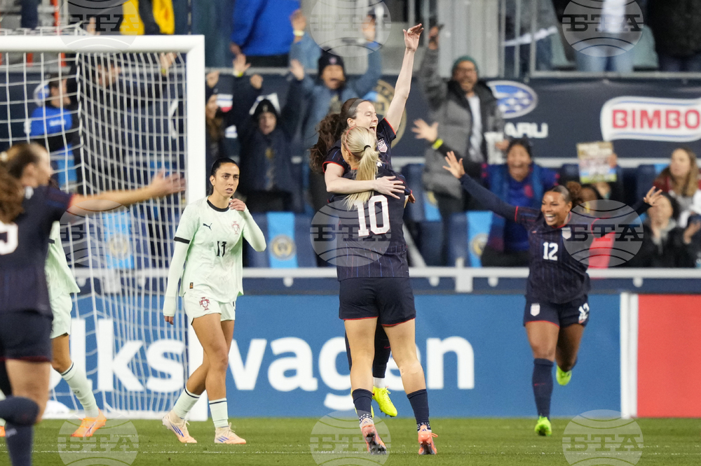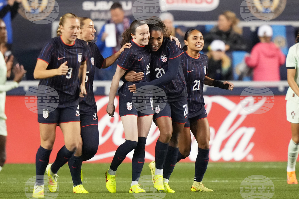 United States' Rose Lavelle, back center, celebrates with Lindsey Heaps (10) and Sam Coffey (17) after Lavelle's goal during the first half of an international friendly women's soccer match against Portugal, Thursday, Oct. 23, 2025, in Chester, Pa. (AP Photo/Matt Slocum)
