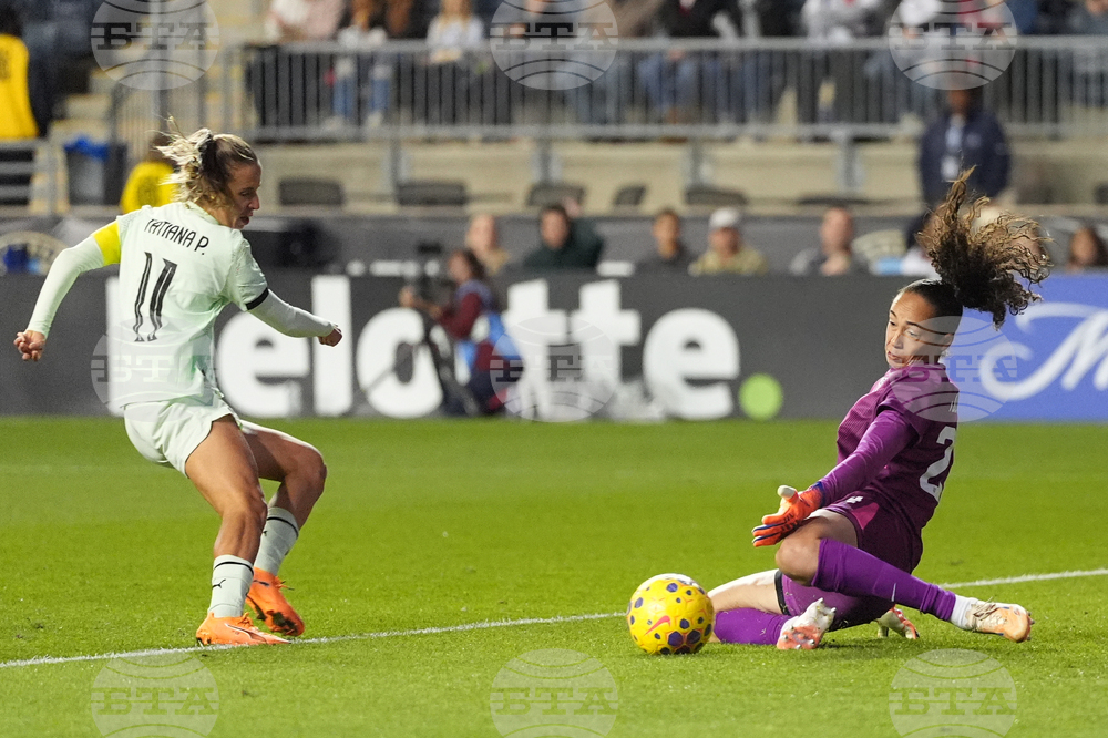 United States' goalkeeper Phallon Tullis-Joyce (24) blocks a shot by Portugal's Tatiana Pinto (11) during the first half of an international friendly women's soccer match, Thursday, Oct. 23, 2025, in Chester, Pa. (AP Photo/Matt Slocum)